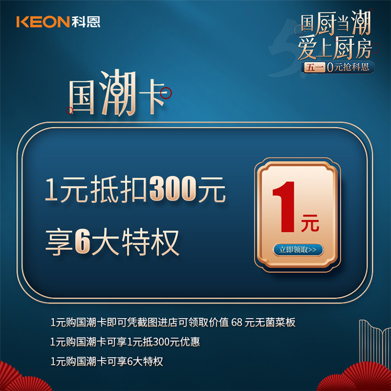 1元國潮卡,限時搶購!購買1元國潮卡,憑截圖即可進店領取價值68元無菌菜板、1元抵300元優惠,同時,可享六大特權!