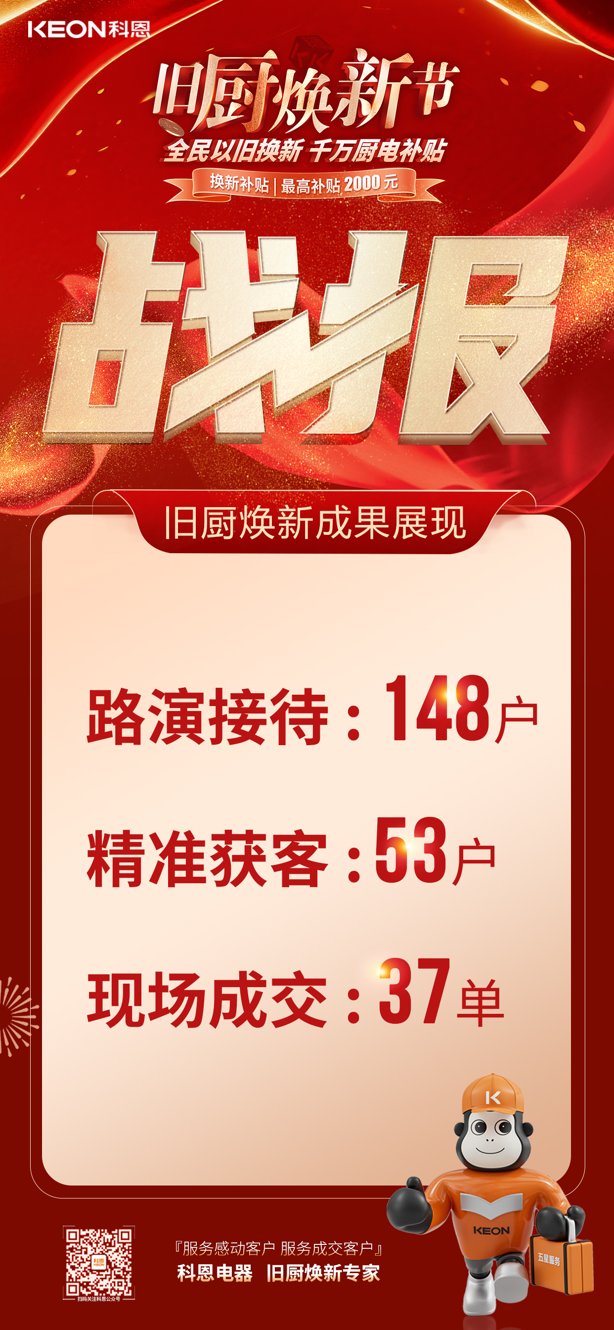 截止目前,科恩舊廚煥新路演活動在河南、河北、江蘇、安徽、湖南等部分城市開展,為期17天,各地陸續進行1-3天的路演,數據統計共接待148戶,精準獲客53戶,現場成交37單,轉化率達25%,取得佳績。通過政企補貼降低消費門檻,讓用戶現場體驗智能廚電升級價值,同時為經銷商打造營銷樣板,推動行業綠色消費升級。